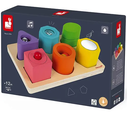 Um verdadeiro playground para bebês! Este colorido quebra-cabeça sensorial, indicado para crianças a partir de 1 ano, ajudará os pequenos a identificar diferentes cores e formas. Cada bloco tem uma função especial para estimular ainda mais o bebê: sino, caleidoscópio, efeitos sonoros, chocalho, apito e espelho. Todos os sentidos serão estimulados, e a criança poderá explorar cada peça no seu próprio ritmo, descobrindo suas funcionalidades de forma independente. Divirta-se observando as reações do seu filho a todas as possibilidades que cada bloco oferece! Como crianças menores de 3 anos costumam levar os brinquedos à boca, utilizamos tinta à base de água para maior segurança. Dimensões: 20,3 x 7 x 13,5 cm.